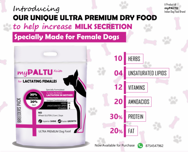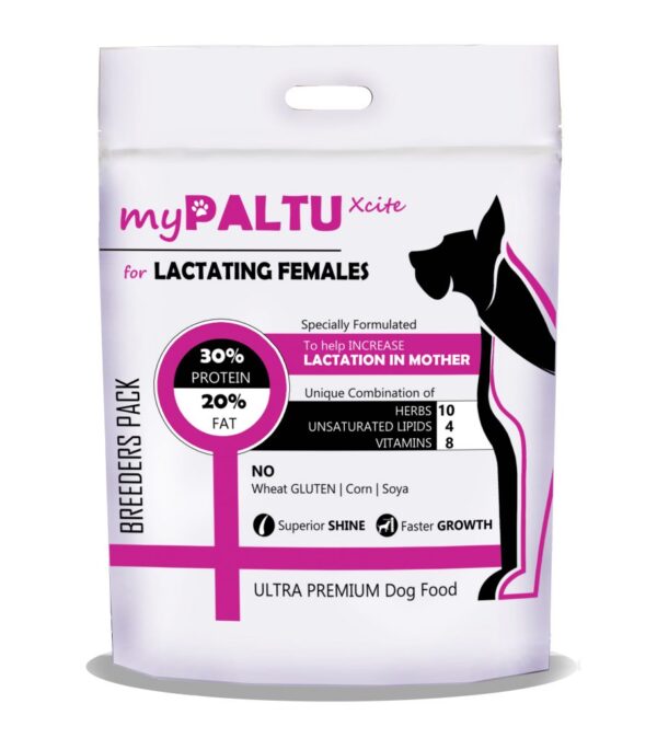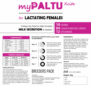 ‘myPALTU Xcite for Lactating Females’ is a very unique food specifically created to help increase Milk Secretion in Mothers. It is an Ultra-Premium dry food made out of 100% indigenous ingredients. No imported ingredient is used in ‘myPALTU’. This is a 100% Indian product, manufactured incorporating the feedback from Indian pet owners faced with day to day problems arising due to Indian agro-climatic conditions. The specialty of ‘myPALTU Lactating Females’ is that it has 80% protein from animal origin. The protein comes from high quality animal sources which is fish and chicken. ‘myPALTU’ does not contain any added Gluten meal. The ingredients added are natural (animal based); which helps in better digestion and improves metabolism in dogs. Our product also contains Organic Calcium. Organic Calcium from Fish Cartilage is known for its presence of ‘Chondroitin Sulphate’ and ‘Glucosamine’; which improves bone strength and skin condition in pets.
