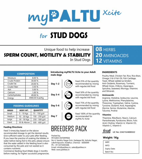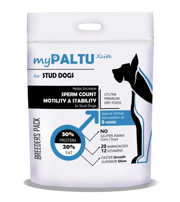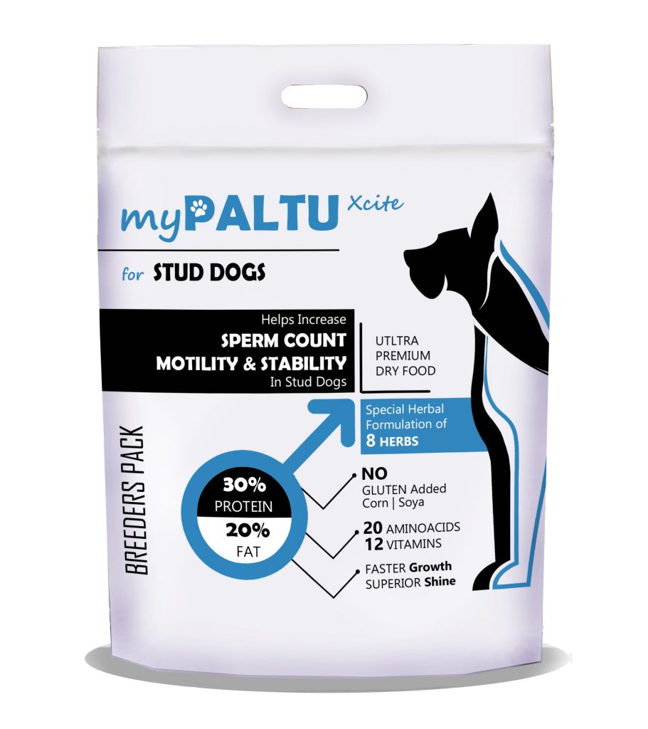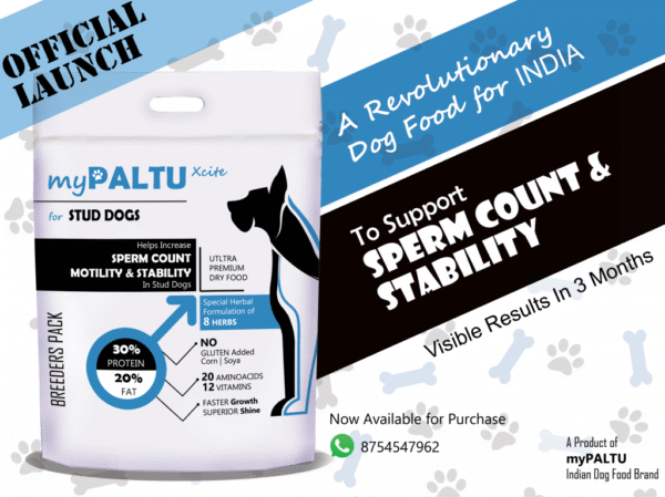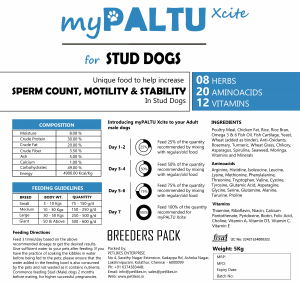 ‘myPALTU Xcite for Stud Dogs’ is a very unique food in the world specially created to help increase Sperm Count, Motility and Stability in Male Dogs. It is an Ultra-Premium dry food made out of 100% indigenous ingredients. No imported ingredient is used in ‘myPALTU’. This is a 100% Indian product, manufactured incorporating the feedback from Indian pet owners faced with day to day problems arising due to Indian agro-climatic conditions. The specialty of ‘myPALTU Stud Food’ is that it has 80% protein from animal origin. The protein comes from high quality animal sources which is fish and chicken. ‘myPALTU’ does not contain any added Gluten meal. The ingredients added are natural (animal based); which helps in better digestion and improves metabolism in dogs. Our product also contains Organic Calcium. Organic Calcium from Fish Cartilage is known for its presence of ‘Chondroitin Sulphate’ and ‘Glucosamine’; which improves bone strength and skin condition in pets.